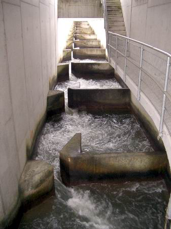 Bei der Fischtreppe (Punkt 5) selbst handelt es sich um eine offene Betonrinne mit Neigung von etwas weniger als 4 Grad (1 m Anstieg auf 15 m Länge). Der oberwasserseitige Abschnitt hat eine Länge von ca. 200 m. Er besteht aus 37 hintereinander angeordneten Becken, die miteinander durch senkrechte Schlitze verbunden sind. Während des anstrengenden Aufstiegs können sich die Fische in den einzelnen Becken ausruhen. Jedes Becken hat eine Fläche von 15 m² und eine Wassertiefe von 1,50 m. 300 Meter müssen die Fische zurücklegen, bis sie am Oberwasser wieder in den Rhein zurückgelangen.